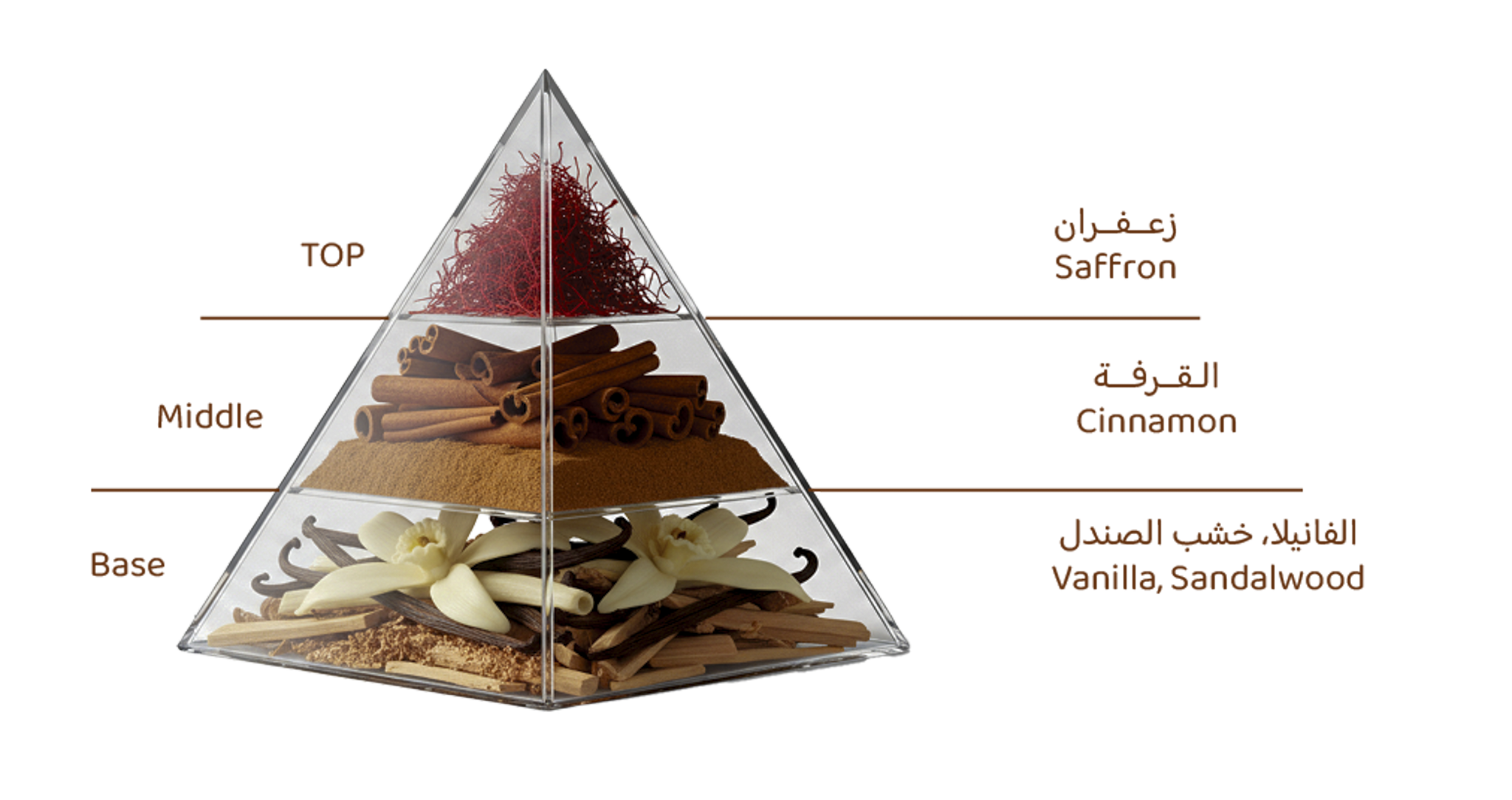 • رائحة التوابل الفواحة من الزعفران والقرفة على قاعدة دافئة من الفانيلا وخشب الصندل الشرقي الناعم